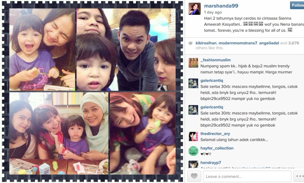 "Hari dua tahunnya bayi cerdas isi cintaaa Sienna Ameerah Kasyafani... wof you Nena banana tomat. Forever, you're a blessing for all of us," tulis perempuan yang akrab disapa Caca itu, pada Kamis (22/1/2015).