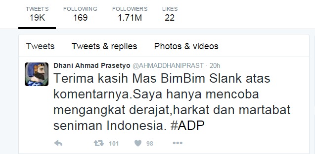 "Terima kasih Mas Bimbim Slank atas komentarnya. Saya hanya mencoba mengangkat derajat, harkat, dan martabat seniman Indonesia. #ADP ," tulis Dhani.