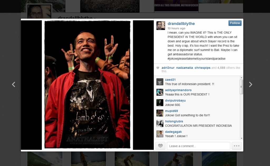 "Dapatkah Anda membayangkan? Ini SATU-SATUNYA PRESIDEN DI DUNIA yang dimana dapat Anda ajak diskusi album Slayer mana yang paling keren. Saya ingin presiden mengundang saya dalam konferensi peselancar di Bali. Mungkin saya bisa mendapat status duta untuk itu. #jokowipleasetakemetoyourislanparadie," tulis Blythe mengomentari foto tersebut.