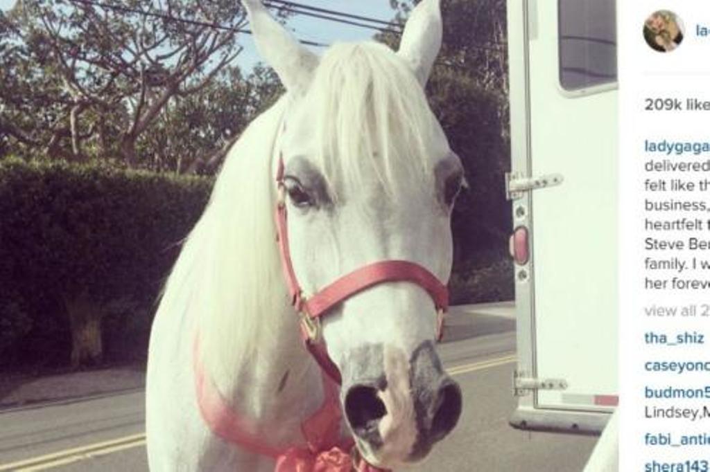 "Hari ini didepan pintu rumah saya ada malaikat putih yang jatuh dari langit. Terima kasih John Jannick dan Steve, seluruh keluarga Interscope, saya akan rawat kuda ini, dan menyayangi selamanya," tulis Gaga di akun Instagramnya.