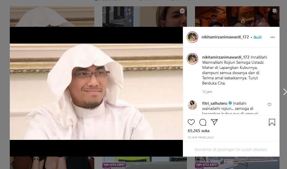 “Innallilahi Wainnalilahi Rojiun. Semoga Ustaz Maher dilapangkan kuburnya, diampuni semua dosanya dan di Terima amal kebaikannya. Turut Berduka Cita,” tulis Nikita, Senin, 8 Februari 2021.