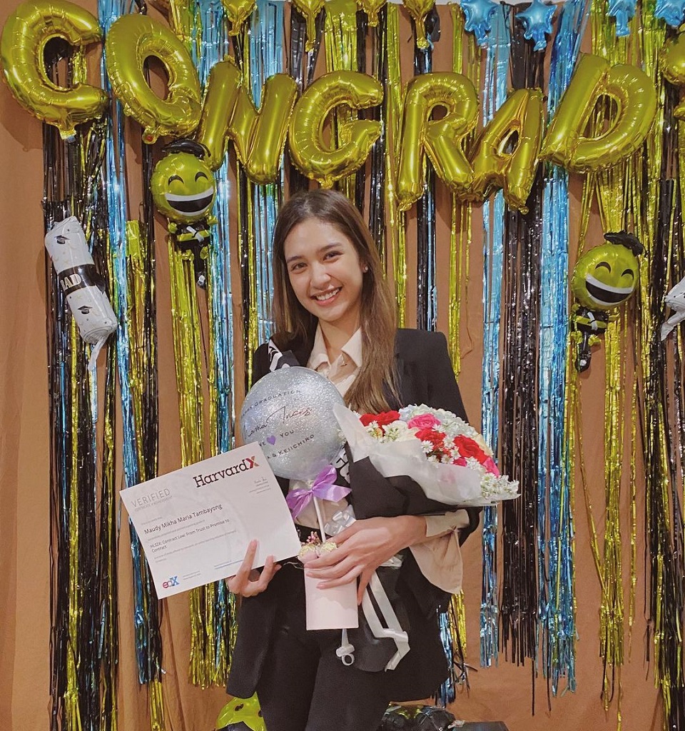 "Maudy Mikha Maria Tambayong, S.H., MM., dengan Program Pascasarjana Internasional dari Harvard Business School dan kursus singkat tambahan konsentrasi hukum kontrak dari HarvardX. Ini aku persembahkan untuk Mamaku. Kami berhasil," tulis Mikha.