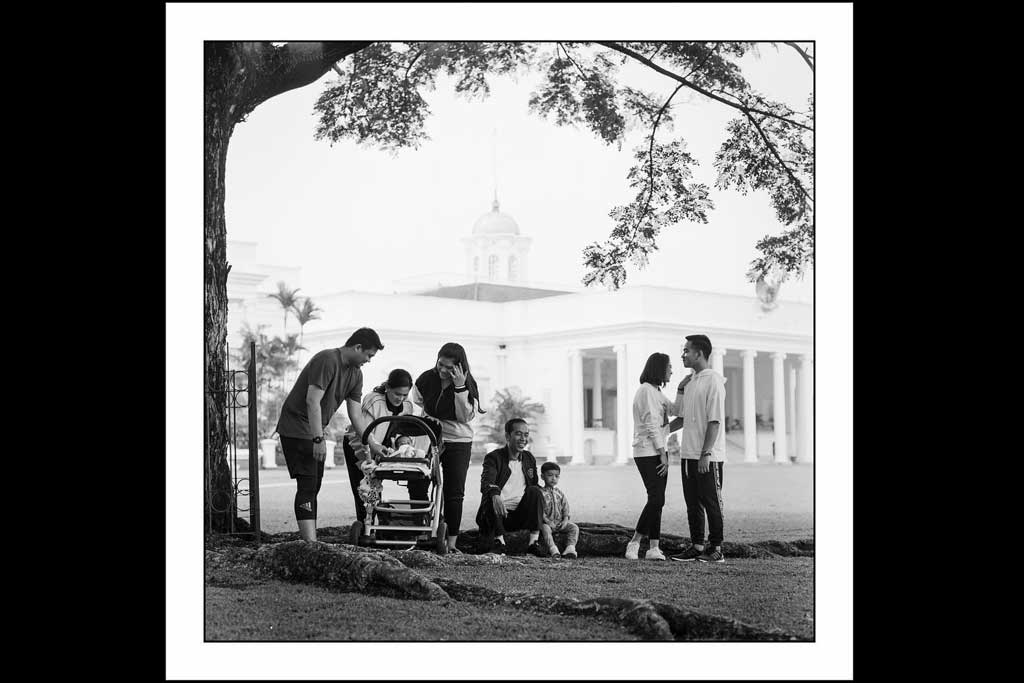 Foto berwarna hitam putih ini tampak seperti sebuah adegan: Jokowi sedang duduk dan tertawa bersama sang cucu Jan Ethes, dan Iriana tersenyum bersama cucunya Sedah yang berusia empat bulan dan berbaring di kereta dorong bayi, didampingi Kahiyang dan Bobby. Lalu Gibran sedang ngobrol berdua dengan Selvi yang tertawa.