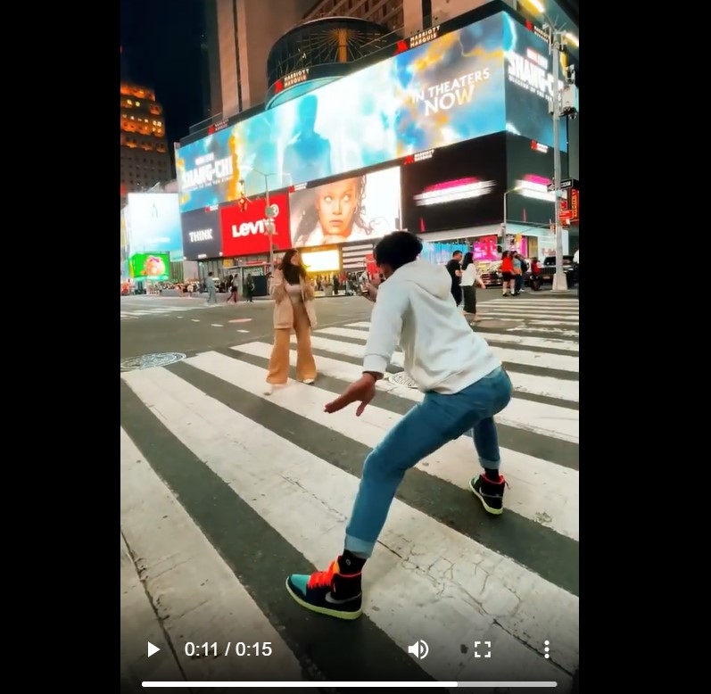 Denny tampak asyik berjoget di tengah jalan, tepatnya di penyeberangan jalan di sekitar Time Square. Dia berjoget sembari memegang handphone, menyoroti sang istri yang juga asyik berjoget.