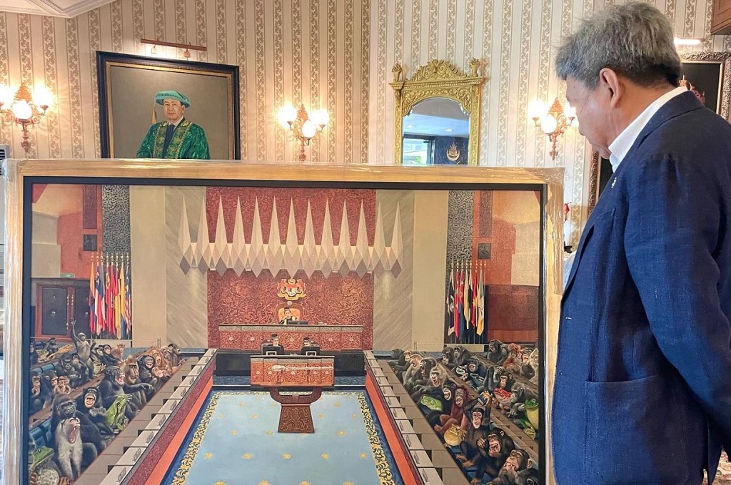 Shah Alam: Warganet Malaysia heboh lantaran Sultan Selangor, Sharafuddin Idris Shah, membeli lukisan unik yang menggambarkan Parlemen Malaysia dengan sejumlah primata dan katak menduduki kursi anggota.