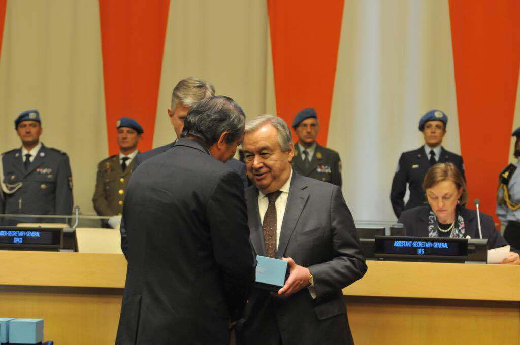 Sekretaris Jenderal PBB Antonio Guterres menyerahkan langsung penghargaan itu kepada Wakil Tetap RI di PBB, Dian Triansyah Djani di New York, Amerika Serikat, 24 Mei.