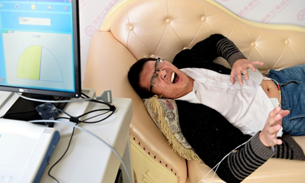 Simulasi di Rumah Sakit Aima ini, menggunakan sebuah alat yang ditanam di perut para pria. Dari hasil tes, pria-pria itu merasakan sakit selama lima menit dan di saat bersamaan perawat meningkatkan intensitasnya dari skala satu hingga 10.