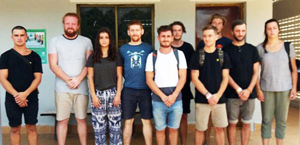 Polisi di kota Siem Reap, dekat kuil kuno Angkor Wat yang terkenal di dunia, mengatakan kelompok itu, termasuk enam orang Inggris, sedang diinterogasi.