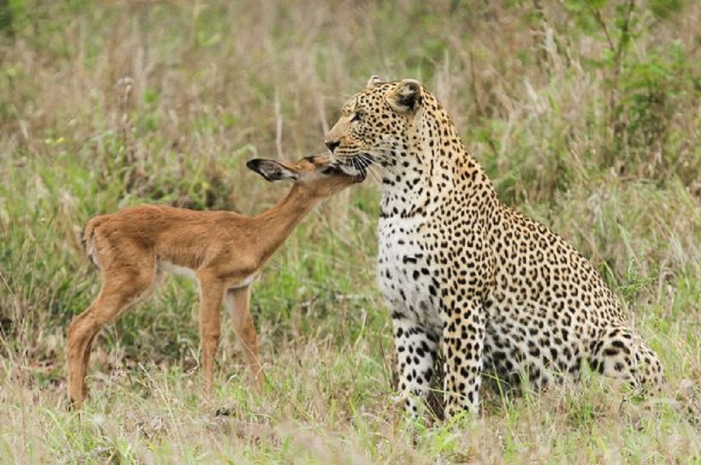 Bahkan saat macan tutul itu bereaksi dan 'bermain kasar,' kijang muda itu tidak mencoba melarikan diri. Ia bahkan mengikuti 'teman' barunya di padang rumput.