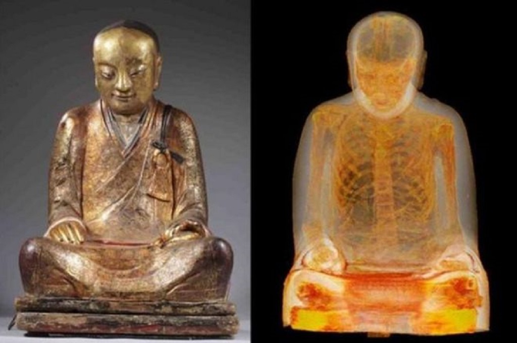 Sebuah pemindaian dengan Sinar-X terhadap patung itu beberapa tahun lalu menunjukkan bahwa isinya adalah jasad seorang biksu, yang diperkirakan sudah berumur 1.000 tahun.