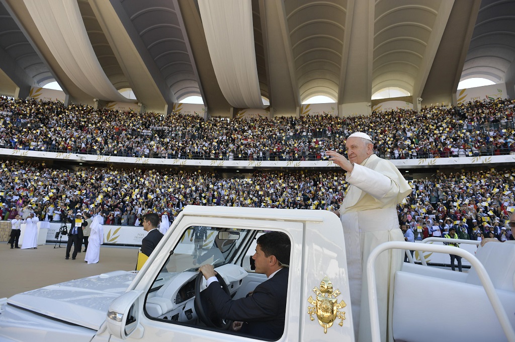 Menaiki Popemobile menuju Stadion Zayed Sports City, Fransiskus melambaikan tangan ke ratusan ribu orang yang membawa bendera kuning Vatikan dan spanduk lainnya. Sebuah altar dengan salib besar terpasang di lokasi misa.