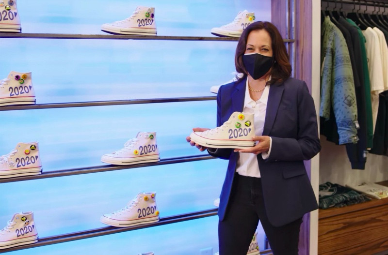 Awal bulan ini, Harris membuat Internet menjadi hiruk pikuk ketika dia turun dari pesawat di Milwaukee, Wisconsin mengenakan blazer, jeans gelap, masker wajah dan (sepatu Converse) Chuck Taylors yang nyaman pada Senin, 7 September. Menurut the Washington post, video dari kedatangannya telah dilihat hampir 8 juta kali di Twitter.
