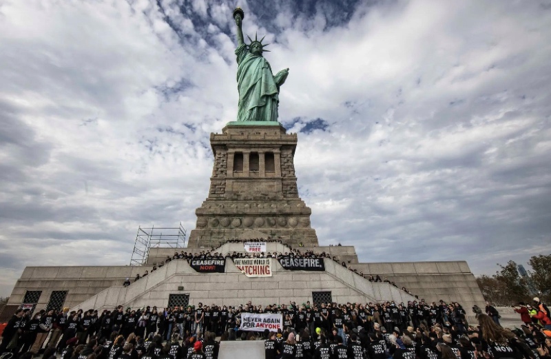 Protes di Patung Liberty dimulai secara tidak mencolok. Para pengunjuk rasa bercampur dengan turis yang berkeliaran di Pulau Liberty sampai –,dipicu oleh ledakan nyanyian yang terdengar dari dekat alas patung,– mereka mengenakan kaus hitam bertuliskan “Warga Yahudi Dukung Gencatan Senjata Sekarang,” dan mulai memanjat tangga alas.