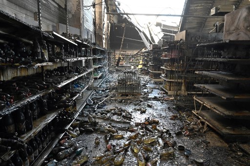 Yang tersisa dari mal hanyalah puing-puing hangus, bongkahan dinding yang menghitam, dan tulisan-tulisan dari bagian depan toko yang hancur.