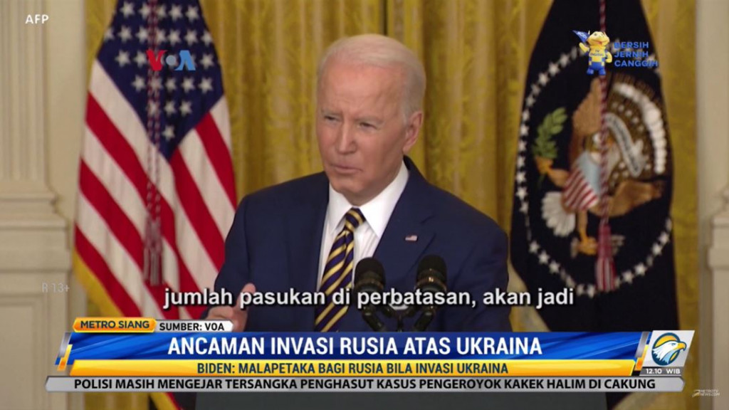 "Rusia akan menanggung risikonya bila menginvasi Ukraina,” tegas Biden dalam pidatonya, sebagaimana dikutip dari tayangan Metro Siang di Metro TV, Rabu, 26 Januari 2022.