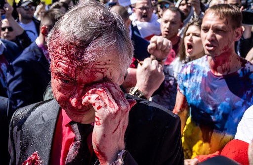Kemudian, beberapa aktivis menyiramkan cairan berwarna merah darah ke Andreev dan sejumlah diplomat yang mendampinginya.