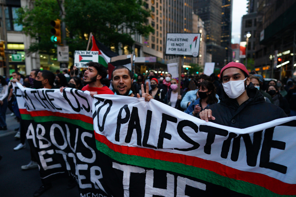 Beberapa pengunjuk rasa membentuk barikade sambil membawa bendera Palestina berwarna merah, hitam, putih, dan hijau yang dikibarkan. Sementara itu, para pendukung Palestina sempat bentrok dengan pendukung Israel yang juga berunjuk rasa di sana.