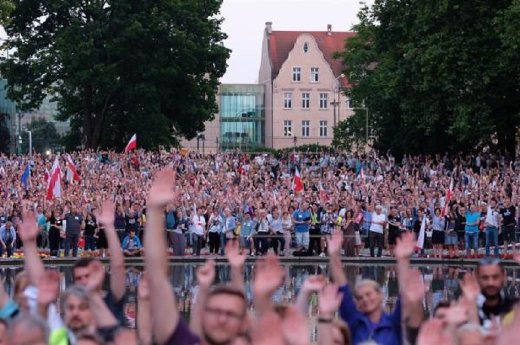 Dalam sebuah demonstrasi di Istana Presiden, para pengunjuk rasa -- yang membawa bendera Polandia dan Uni Eropa -- menuntut hak veto atas rancangan undang-undang tersebut. RUU itu disponsori partai Law and Justice (PiS) yang berkuasa.