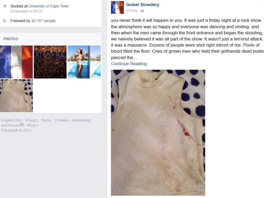 "Saat aku terbaring dalam darah orang yang tak aku kenal dan menunggu peluru mengakhiri hidupku selama 22 tahun ini, aku melihat bayangan semua orang yang aku sayangi dan mereka mengucapkan 'I love you', berulang-ulang kali," tulis Bowdery dalam statusnya di Facebook, Sabtu (14/11/2015).
