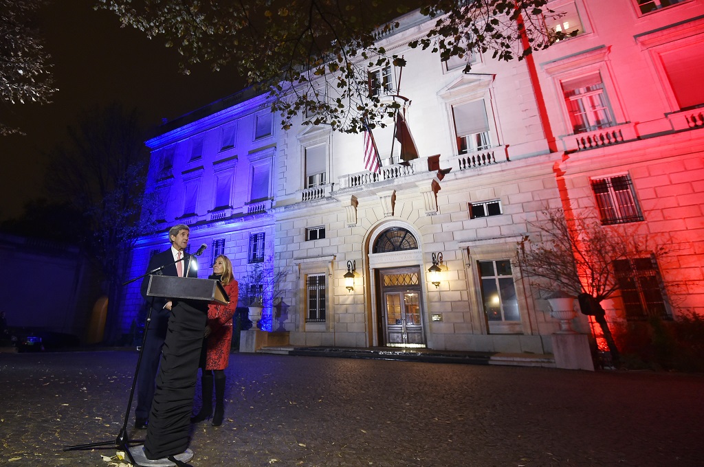 Di depan Kedutaan Besar AS di Paris, yang dilengkapi atribut warna bendera Prancis, Kerry bertekad mengalahkan terorisme.
