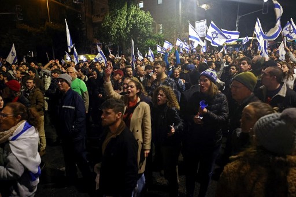 Langkah pemecatan memicu aksi protes besar-besaran di Tel Aviv, dengan ribuan orang memblokir jalan raya utama, dan mengibarkan bendera Israel.