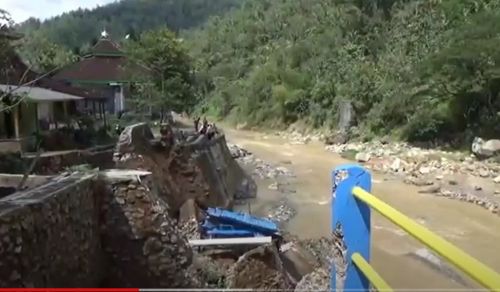 Pacitan: Sebuah talud penahan bendungan aliran anak sungai Grindulu di Kecamatan Arjosari, Pacitan, Jawa Timur ambrol setelah hujan deras, Rabu dini hari, 22 Juni 2021.