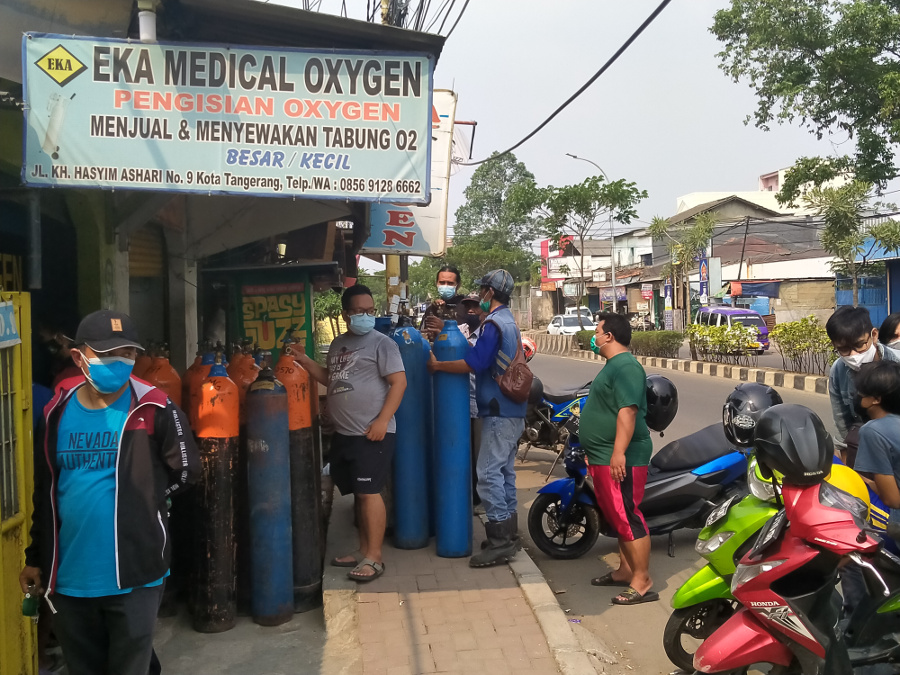 Puluhan orang mengantre untuk mendapat isi ulang oksigen di depot pengisian ulang Jalan KH Hasyim Ashari, Cipondoh, Kota Tangerang. Antrean terjadi karena persediaan oksigen menipis bahkan habis di beberapa depot pengisian semenjak pandemi covid-19 melanda.