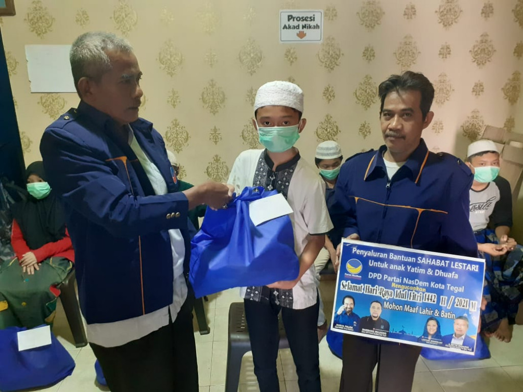 Tegal: DPD Partai NasDem Kota Tegal melalui Sahabat Lestari menyalurkan paket bantuan berupa kebutuhan pangan kepada anak yatim dan kaum dhuafa di Kota Tegal, Jawa Tengah. Bantuan juga diberikan pada para perantau di kota tersebut yang tak bisa mudik.