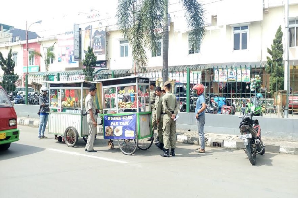 Petugas mendatangi PKL di sepanjang Jalan Hardiwinangun. Petugas meminta pedagang tak berjualan di jam-jam yang ditentukan.