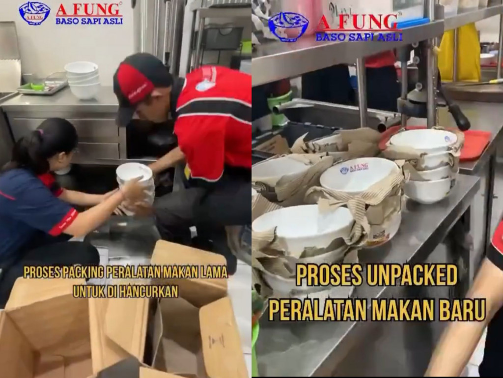 Melalui video yang dibagikan oleh akun Instagram @basoafung terlihat sejumlah pegawai Baso A Fung mengemasi peralatan makan berupa mangkuk ke dalam kardus. Alat-alat makan itu kemudian dibawa keluar area restoran.