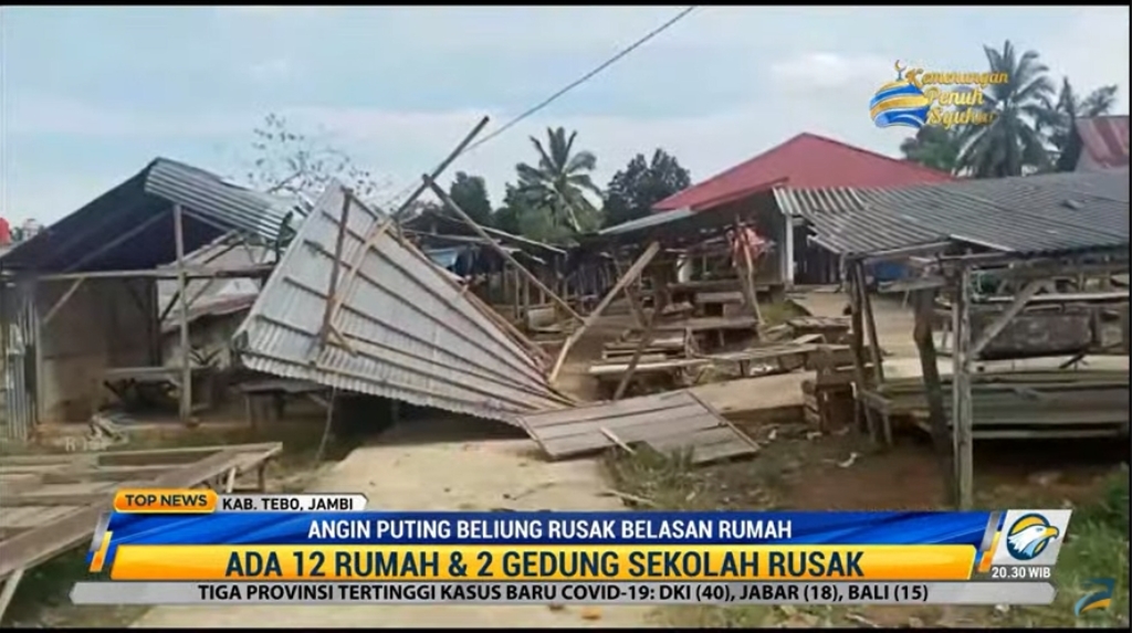 Jambi: Pada suasana Lebaran 2022, belasan unit rumah dan dua bangunan sekolah di Kabupaten Tebo, Jambi, rusak akibat terjangan angin puting beliung. Warga berharap pemerintah daerah setempat dapat segera membantu memperbaiki rumah mereka yang rusak.