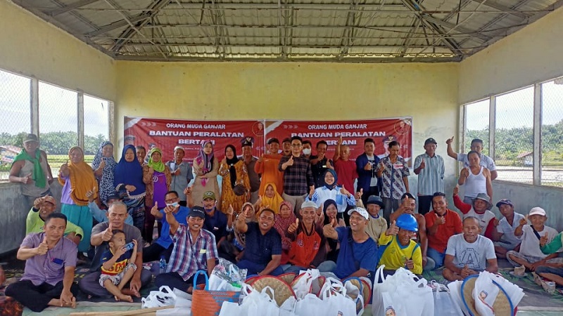 Batu Bara: Sekelompok pemuda, milenial, hingga mahasiswa yang tergabung dalam relawan Orang Muda Ganjar (OMG) Kabupaten Batu Bara memberikan bantuan alat pertanian untuk kelompok tani di Desa Antara, Kecamatan Lima Puluh, Kecamatan Lima Puluh, Batu Bara, Sumtera Utara. Bantuan itu untuk mendorong produktivitas petani.