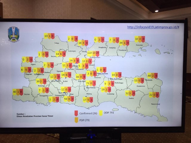 Pada kesempatan tersebut, Khofifah sempat menunjukkan data penyebaran korona di daerah-daerah di Jatim. Lewat situs itu, kata Khofifah seluruh jumlah kasus covid-19 baik positif, orang dalam pemantauan (ODP), dan pasiem dalam pengawasan (PDP), bisa diakses online beserta peta sebarannya.