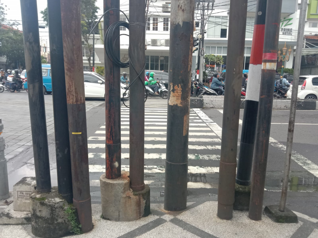 media sosial. Pasalnya, ujung sebelah barat marka penyeberangan jalan tersebut ditutup oleh sejumlah tiang listrik dan provider telekomunikasi.