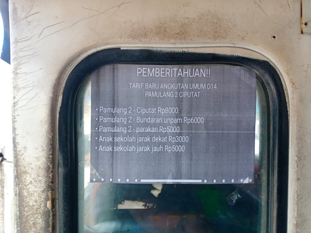 Rohadi mengaku kenaikan harga BBM sangat terasa. Ia pun mencantumkan daftar tarif angkutan D14 rute Pamulang-Ciputat yang terpasang di pintu angkot