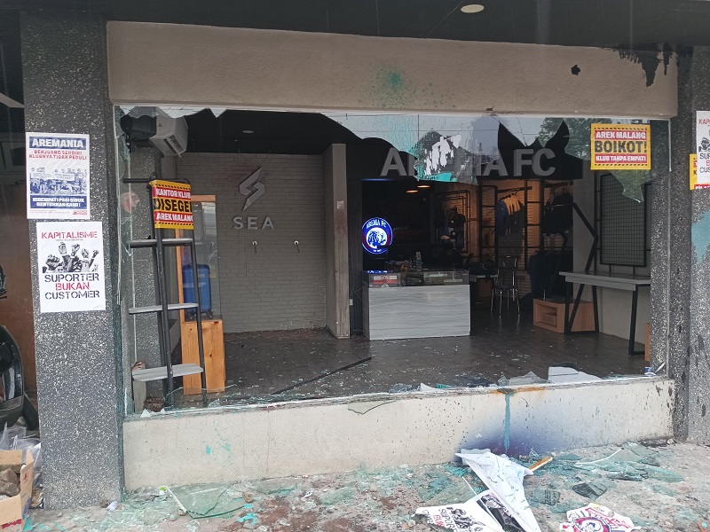 Malang: Kantor Arema FC berlabel Kandang Singa di Jalan Mayjend Panjaitan Nomor 42, Penanggungan, Kecamatan Klojen, Kota Malang, Jawa Timur, dirusak massa. Kerusakan akibat lemparan batu dan sejumlah benda pada Minggu siang, 29 Januari 2023.