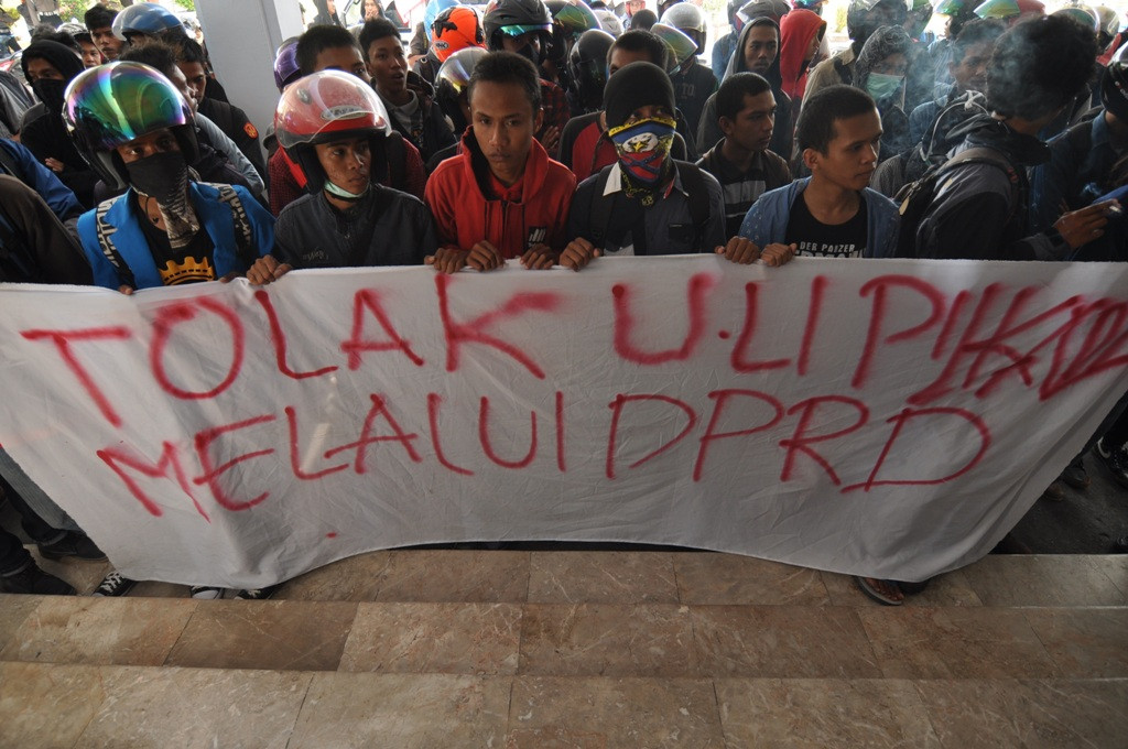 medcom.id, Palu: Mahasiswa Universitas Tadulako (Untad) Palu terlibat bentrok dengan polisi dalam unjuk rasa menolak Udang-Undang Pemilihan Kepala Daerah (UU Pilkada) di depan Kantor DPRD Provinsi Sulawesi Tengah, Palu, Kamis (2/10/2014). Satu anggota polisi dilarikan ke rumah sakit karena terluka dan puluhan mahasiswa diamankan.