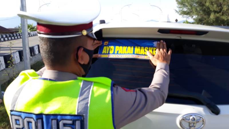 Polantas juga memasang stiker yang bertuliskan 'ayo pakai masker' di kendaraan-kendaraan roda empat, agar masyarakat selalu menggunakan masker sebagai kebutuhan yang vital di masa pandemi covid-19.