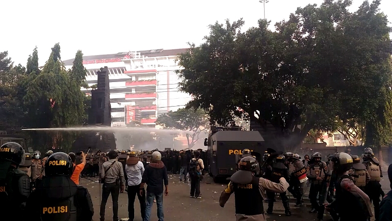 Demonstrasi menolak UU Cipta Kerja di depan Gedung DPRD Jateng berakhir bentrok. Polisi membubarkan paksa ribuan massa dari aliansi mahasiswa dan buruh karena aksi mereka diwarnai dengan membakar ban dan melempar batu ke arah Polisi.