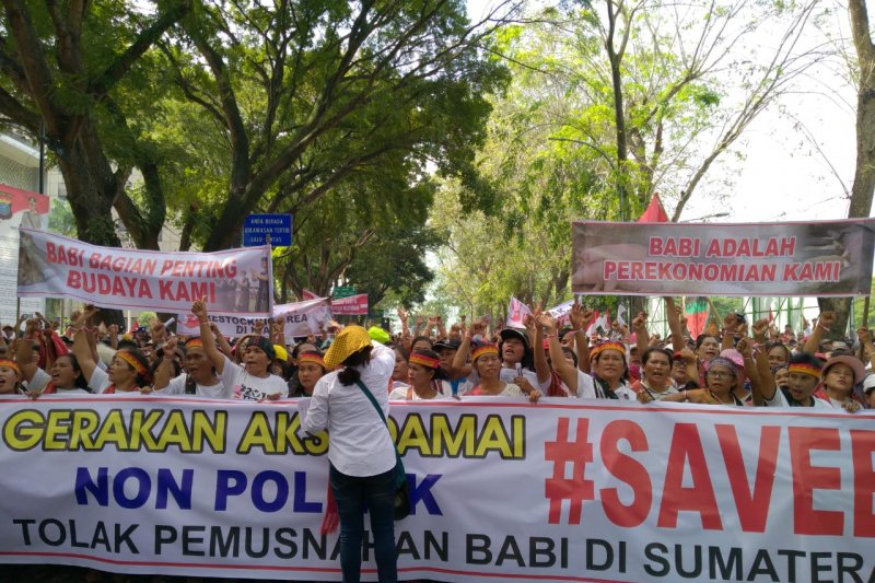 "Save babi, save babi," teriak pengunjuk rasa Boasa Simanjuntak, saat berorasi, di depan DPRD Sumut, Kota Medan, Sumut, melansir Antara, Senin, 10 Februari 2020.