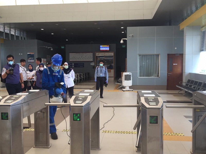 “Penyemprotan dilakukan di titik-titik yang rentan menyebabkan penularan virus di antaranya kursi, tempat pegangan, toilet, lift, loket, eskalator, dan pintu masuk,” ungkapnya.