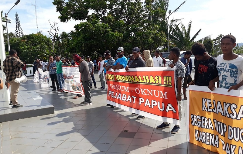"Dengan mencermati penetapan tersangka Bupati Waropen yang kontradiksi dengan intruksi Jaksa Agung RI dan keputusan Kajati Papua yang tidak bersesuaian, maka kami menduga ada oknum kejati telah bekerjasama untuk tidak menghormati intruksi Jaksa Agung," jelas Sawaki saat demo di kantor Kejati Papua.