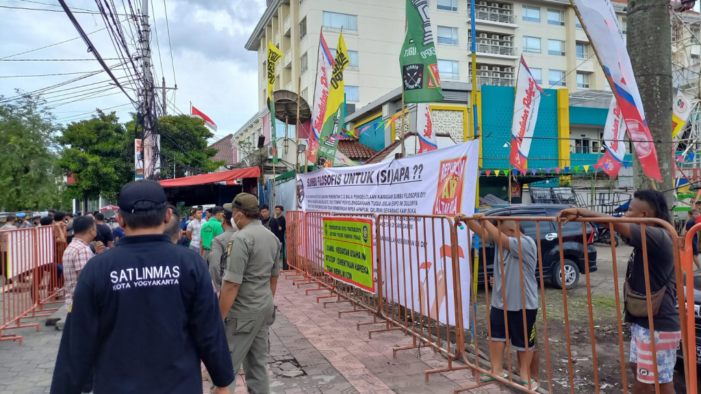Yogyakarta: Satuan Polisi Pamong Praja (Satpol PP) Kota Yogyakarta menutup paksa Pasar Rakyat Tugu Jogja Expo (TJE) di Jalan Margo Utomo. Panitia Pasar Rakyat TJE dituding tak kantongi izin.
