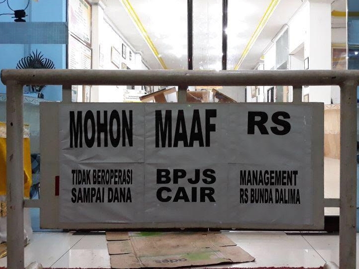 Foto menunjukkan papan bertuliskan, “Mohon maaf RS tidak beroperasi sampai dana BPJS cair. Tertanda management RS Bunda Dalima."