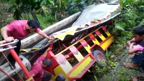 Madiun: Odong-odong kereta kelinci yang mengangkut sekitar 40 orang terjun dari sebuah jembatan ke saluran air di persawahan Desa Joho, Kecamatan Dagangan, Kabupaten Madiun, Jawa Timur, Minggu, 6 Februari 2022. Peristiwa ini menyebabkan dua orang tewas dan puluhan lainnya terluka.