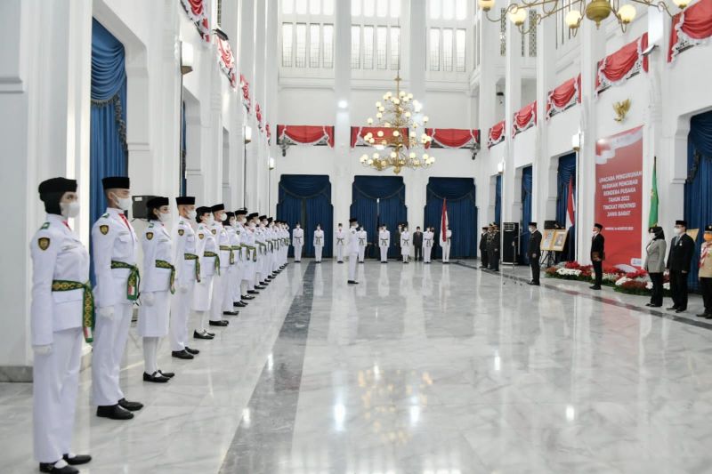 Bandung: Gubernur Jawa Barat (Jabar) Ridwan Kamil mengukuhkan 54 anggota Pasukan Pengibar Bendera Pusaka (Paskibraka) Tingkat Jabar Tahun 2022, di Aula Barat Gedung Sate, Kota Bandung, Minggu, 14 Agustus 2022.