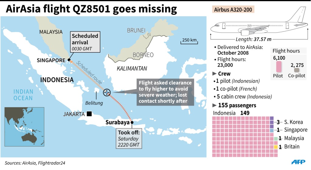 Pesawat AirAsia QZ8501 hilang kontak Minggu (28/12/2014) pukul 06.17 WIB, dalam perjalanan dari Bandara Juanda menuju Bandara Changi, Singapura. Kemenhub dan otoritas lainnya memperkirakan pesawat itu hilang kontak di antara Pulau Belitung dan Kalimantan.
