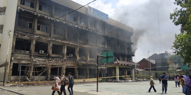 Bekasi: Api yang sempat padam kembali menyala di lantai 2 Gedung A SMK Yadika 6 di Jalan Wadas Raya, Kelurahan Jaticempaka, Kecamatan Pondokgede, Kota Bekasi, Jawa Barat, pada Selasa, 19 November 2019, sekitar pukul 12.30 WIB. Munculnya api diketahui seorang warga yang tengah melihat kondisi gedung sekolah dari luar pagar.