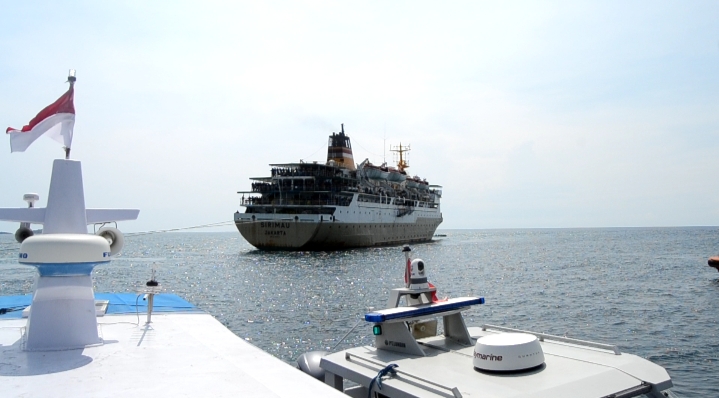 Tampak di lokasi Kapal Gandha Nusantara 14 milik Pemda Lembata sudah berada di lokasi untuk berupaya memulangkan 83 penumpang. Kapal ini sedang mencari posisi yang pas agar para penumpang bisa berpindah kapal dengan mudah.