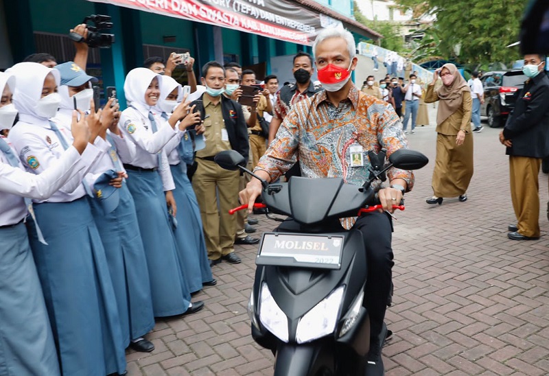 Banjarnegara: Gubernur Jawa Tengah Ganjar Pranowo menjajal Molisel, salah satu motor listrik karya siswa SMK Negeri 2 Banjarnegara, Jawa Tengah. Ganjar mengapresiasi dan bangga dengan capaian para siswa SMK itu.
